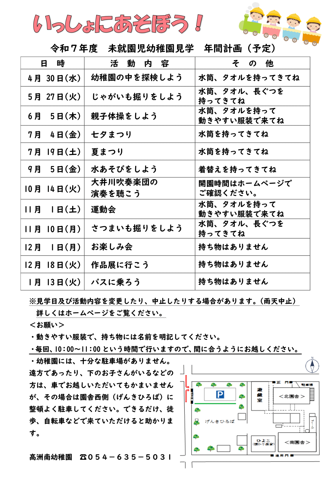 高洲南幼稚園では、以下の日程で見学を行っております。ほかの日に見学をご希望の場合は、